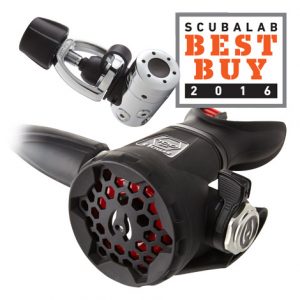 “With its lustrous chrome finish, braided hose and sleek design details, the 100LX looks like a more expensive reg than it is. It dives the same way, earning top scores in its category for ease of breathing in swim position. Divers praised the reg’s soft, predictable purge and scored the second stage very good for comfort. One of the few signs of cost-consciousness was the single HP port (there are four LP ports), but divers still rated the arrangement very good for setup. Like most regs in the category, there’s no breathing adjustment, but the 100LX didn’t seem to need one; it flowed air with just a hint of inhalation, although some divers found it a little too eager, as though on the edge of free-flow. But with the Venturi switch — easy to grasp and smooth to operate — in predive it was hard to make it free-flow at the surface, even intentionally. With impressive performance and attention to detail at an attractive price, the 100LX is our Best Buy.”